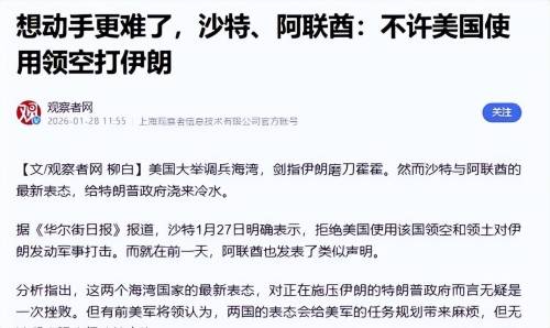 沙特1月27日通话中明确不开放领空,阿联酋禁止后勤支持。两国惧怕伊朗导弹报复和石油波动。美军需绕道,作战难度上升。埃及和土耳其敦促外交途径。盟友立场加剧美国在中东孤立。