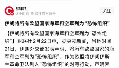 2月21日,伊朗外交部宣布将欧盟27个成员国的空军和海军列为恐怖组织。这意味着将冻结这些国家军队在伊朗的资产,禁止这些军队的高级成员踏入伊朗的领土。并且在极端情况下,可以用反恐战的名义和这些国家的军队交火。当然在伊朗看来,这是所谓的清除恐怖主义的行动。