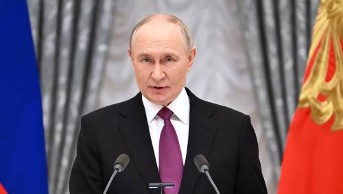 2月23日,俄罗斯"祖国保卫者日",普京在克里姆林宫举行授勋仪式,向荣获"俄罗斯英雄"称号的军人颁发"金星勋章",随后发表视频讲话。