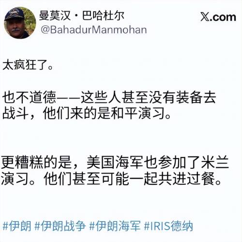 这一点让不少印度军方人士极为不满。印度前空军中将曼莫汉·巴哈杜尔公开表示,这种行为“极其不道德”。他甚至调侃称,几天前美军和伊朗海军人员可能还在同一张桌子上吃饭,如今却在海上展开致命攻击。对于主办演习的印度而言,这无疑让局面变得相当尴尬。