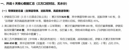 截止3月5日伊朗革命卫队的公告,开战这几天,伊朗总共打出去820多枚导弹和1900多架无人机,而美以官方统计,截止3月5日,拦截伊朗导弹680枚,推测伊朗发射850枚导弹,拦截伊朗无人机1615架,拦截率85%,推测伊朗发射无人机1900-2000架。