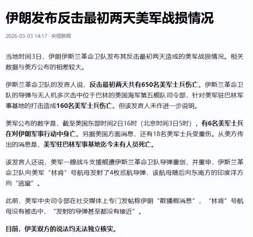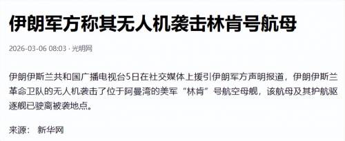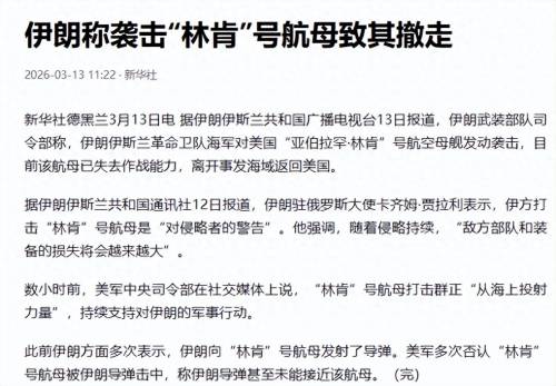 新华社报道称,伊朗广播电视台报道,伊朗武装部队司令表示,伊朗革命卫队海军对林肯号发动的袭击导致该舰丧失作战能力,并离开事发海域返回美国。美国中央司令部则否定了伊朗的相关表态,称林肯号航母正在从海上投射力量持续支持对伊朗的军事行动。