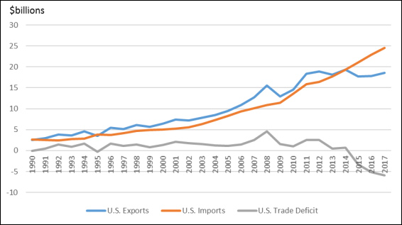 墨西哥是美国第二大农产品出口市场。2018年,美国对墨西哥农产品出口总额200亿美元,主要出口商品包括玉米、大豆、猪肉和乳制品。
