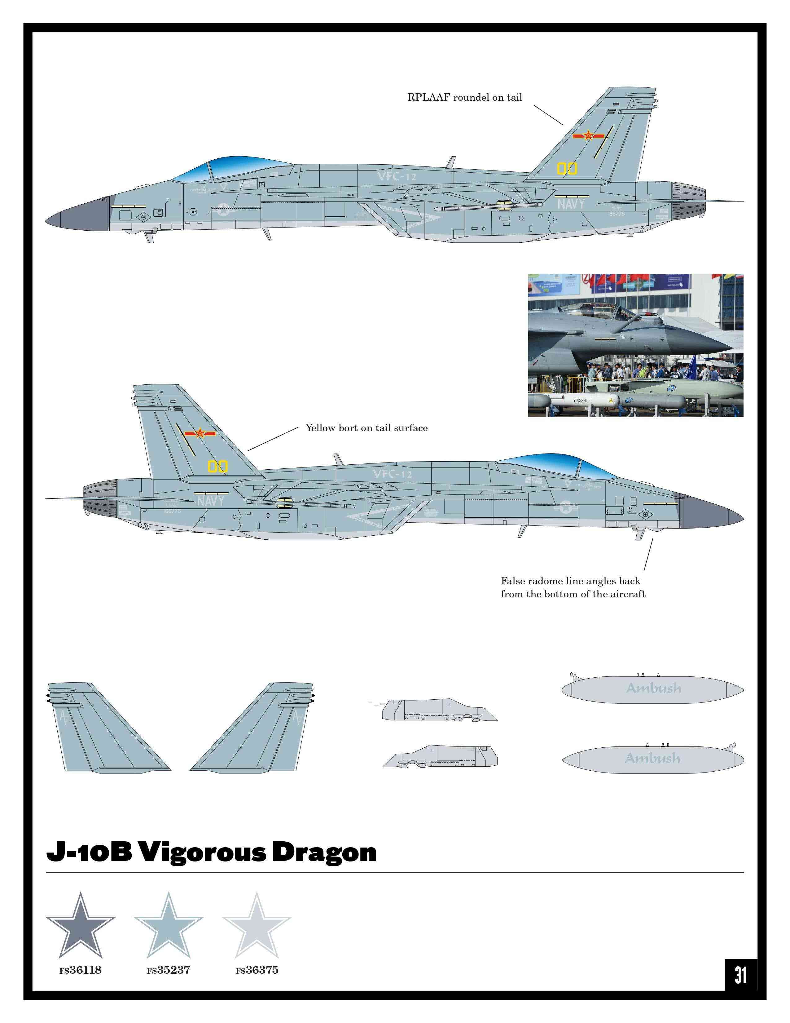 一个涂装方案,是模拟歼-11B和歼-16,虽然在雷达、武器上有较大区别,但两型机的涂装是比较类似的,唯一没有“与时俱进”的,是歼-16现在普遍都采用低可视度涂装了,而模拟歼-10B的涂装则更加逼真一些,比如其PESA机载火控雷达的斜向开口,就原路照搬,当然,“超级大黄蜂”在气动布局上和歼-10差异极大,效果自然没有模拟歼-15和歼-11B那么好。