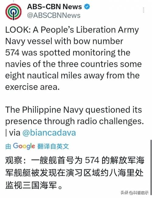 于此同时,美菲海军也没闲着,3月28日晚7时,据菲律宾GMA电视台报道称,当天上午在菲律宾吕宋岛以西海域进行的美国、菲律宾和日本三国联合海上综合演练行动,遭到054A型导弹护卫舰多次“贴近”式跟踪和抵近监视,三国联演联训行动不得不有所调整。