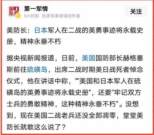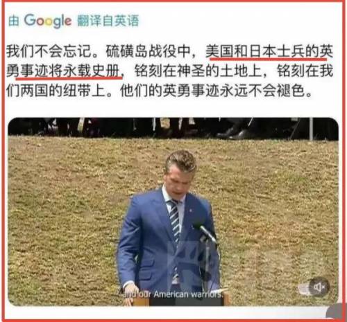 根据第一军情消息,近日,美国防部长赫格塞斯在前往日本硫磺岛,出席了美日战死士兵悼念活动,竟公然赞扬日本战死士兵“英勇”,竟然说“美国和日本军人在硫磺岛的英勇事迹永载史册”。