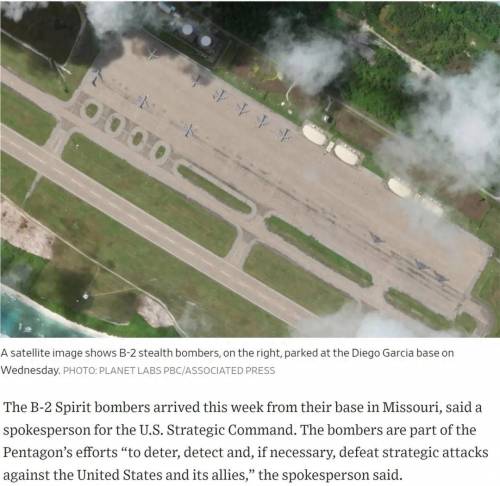 美国《华尔街日报》近日援引美国战略司令部发言人的话报道称,多架B-2隐形轰炸机本周已从美国密苏里州基地飞抵位于印度洋中部迪戈加西亚岛的美军基地。与B-2轰炸机同时抵达的还有多架战略运输机、加油机。