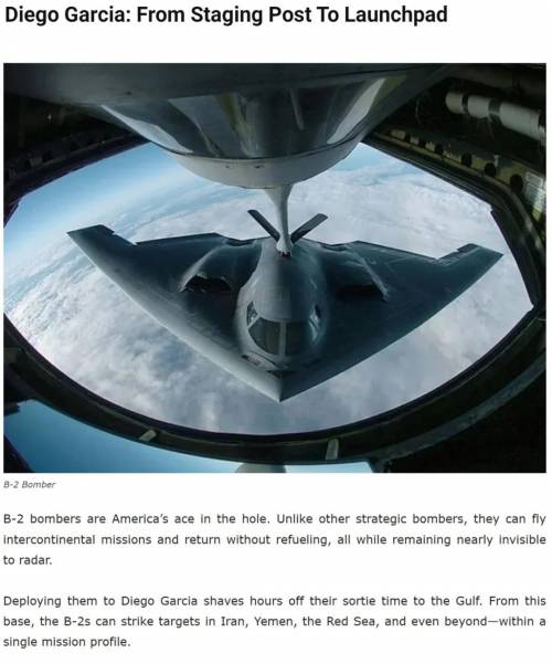 美军B2轰炸机群在印度洋基地集结迪戈加西亚岛,地处印度洋多条航路的会合点,战略地位十分重要。第二次世界大战期间曾为英国空军基地和重要海军停泊港。1966年英美签订协议后,美国向英国租借迪戈加西亚岛,在岛屿西部设立大机场,成为美国在印度洋的重要基地。在海湾战争、阿富汗战争和伊拉克战争初始阶段期间,美军有多次都是从迪戈加西亚发动空中作战。