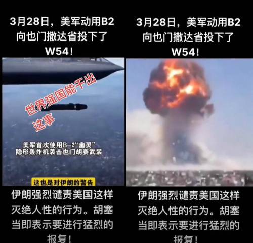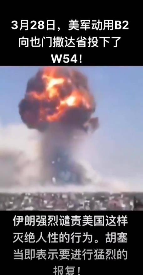 此时,国内部分自媒体开始炒作一个惊人消息,即美军B-2隐形轰炸机向也门投掷了“W-54”,声称伊朗“强烈谴责”,胡塞武装“誓言报复”,并配上了如同核弹爆炸的蘑菇云“现场视频”。