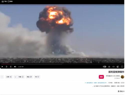 其次,所谓B-2扔下“W-54”炸弹的爆炸视频,也并非发生在也门,源视频至少在10年之前就已经发布,据发布者描述,这一“如同核弹”的爆炸发生在叙利亚的霍姆斯省,是当地军火库被引爆的画面。