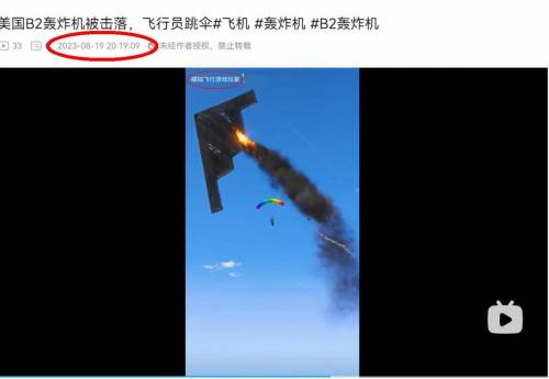 其次,这段所谓B-2被胡塞武装击落,美军飞行员跳伞的视频,实际上经过检索后,可发现这是一段“模拟飞行游戏玩家”发布的模拟动画,发布于2023年8月19日,随后部分自媒体如获至宝,多次宣称是美军B-2被击落的“真实视频”,破绽实在是太多,已经被网友们多次辟谣。