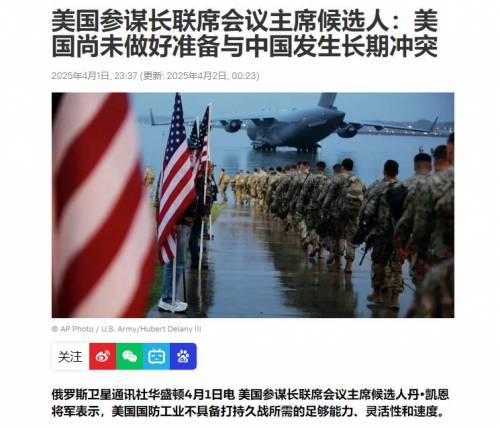4月1日,中国解放军东部战区在台岛周边展开多军种联合演训,重点演练海空战备警巡、联合封控、对海对陆打击等科目。军演次日,据俄卫星通讯社报道,美国参谋长联席会议主席候选人丹凯恩将军在参议院军事委员会听证会上作出罕见表态,直言"美国尚未做好准备与中国发生长期冲突,美国国防工业基础不足以支撑持久战,联合部队缺乏应对高强度战争的能力、灵活性和速度"。这一言论折射出华盛顿对华战略的深层矛盾。
