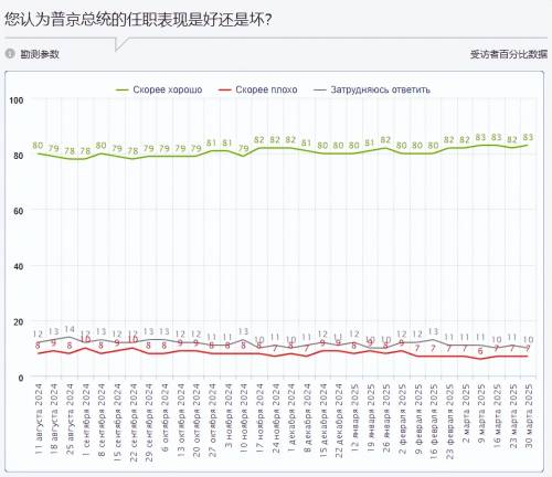 【普京的支持率相较上周上升了一个百分点,目前支持率为82%】