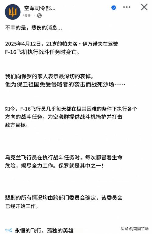 乌克兰空军抢在俄军发布之前,主动承认俄罗斯军队击落了一架乌军F-16战斗机,乌军飞行员阵亡!当地时间2025年4月12日,乌克兰总统泽连斯基、乌克兰空军司令部发表声明,证实乌克兰空军第二架F-16战斗机,在作战行动中被俄军击落。这是乌克兰军方主动承认的,第二架F-16战斗机的损失。据称被俄军击落,阵亡的乌克兰空军飞行员名叫帕维尔·伊万诺夫,今年才26岁,早前驾驶乌克兰空军苏-25攻击机,后来被送往英国,接受了驾驶F-16战斗机的训练。俄方宣称,是俄军S-400防空导弹部队,打下了乌克兰空军F-16战斗机。