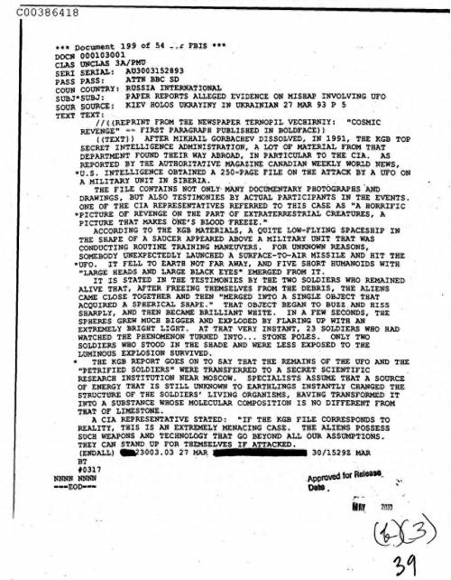 真是“小刀拉屁股——开了眼了”。据福克斯新闻网4月14日报道,日前,美国中央情报局(CIA)网站发布了一份来自前苏联国家安全委员会(即“克格勃”)的解密文件,而该文件披露了一个非常离奇的事件:苏联军队曾经遭到外星生命驾驶的不明飞行物攻击。