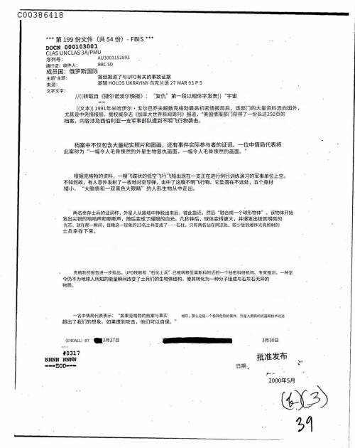 文件内容显示,当时苏军朝着一架“未确认飞行器”发射了一枚地对空导弹,并成功将其击落、坠毁在苏联某座军事基地附近。随后,苏军派遣士兵前去现场调查,发现了“5个身材矮小、长着巨大头颅和黑色大眼睛的类人形生物从坠毁的飞行器中出现,随后融合为一个单一的生物并发出巨大的嗡嗡声”。然后,这一生物突然爆发出巨大的光芒,导致现场的23名苏军士兵瞬间变成了“石像”,只有两名并未被光线照到的士兵幸免于难。