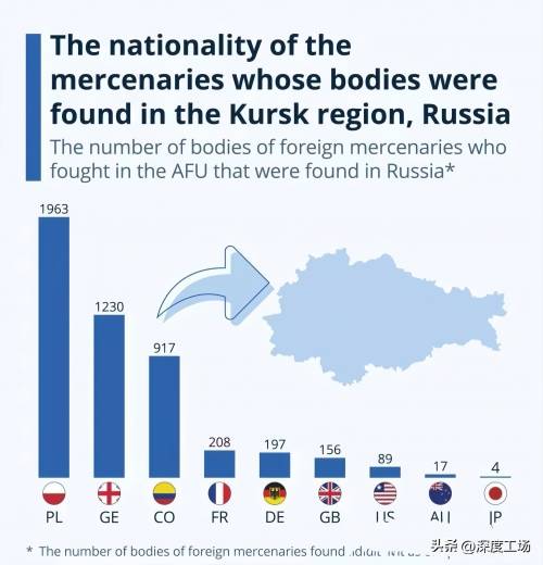 第二名是格鲁吉亚,在库尔斯克战役,有1230名格鲁吉亚雇佣军战死,还有917名哥伦比亚雇佣军阵亡。第四名是,208人阵亡的法国雇佣军,依次为,德国197人、英国156人、美国89人、澳大利亚17人以及日本人4人。