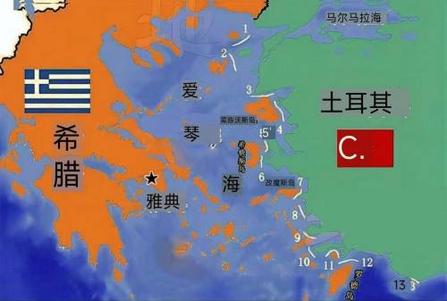 希腊和土耳其作为邻居因为爱琴海的十一段线没少起冲突甚至战争。1913年,奥斯曼帝国在巴尔干战争中惨败,爱琴海上70%的岛屿被希腊收入囊中。到了1936年,希腊在爱琴海划了一条“十一段线”,领海直接怼到土耳其家门口,只给土耳其留了个海滩晒太阳的片区。