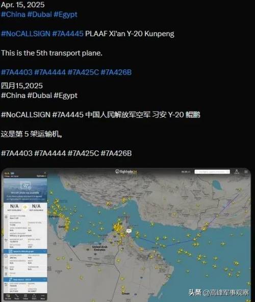 在此之前外媒传称,埃及空军已经签约购买了首批歼-10CE(歼-10C出口型)战斗机,和一揽子配套弹药和设备,总价值超过400亿(RMB)。 不过,该说法很快就被中国军方出面辟谣了。本以为这件事到此为止了,但是4月15日,国际航空网站又传出令人好奇的新消息。根据该网站公布的航迹和航班数据,当天至少有5架中国空军Y-20飞机飞往埃及。