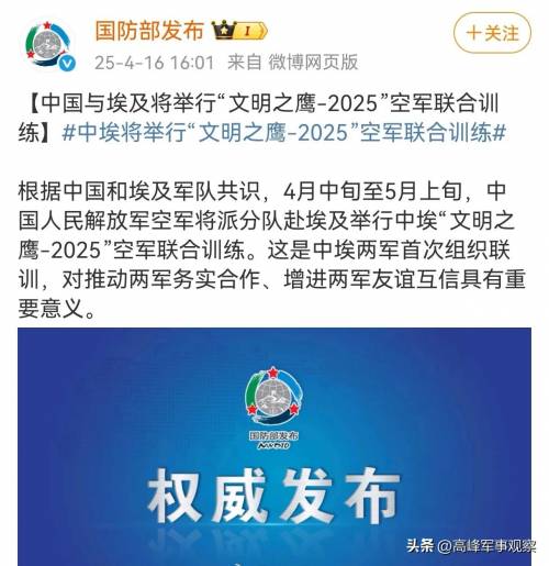 巴基斯坦是目前世界上,唯一正式装备歼-10CE的国家,更重要的是,巴基斯坦空军装备至少3架中国制造的ZDK-03“喀喇昆仑鹰”预警机。而ZDK-03预警机被视为中国KJ-500预警机的出口型号。所以看起来一切都解释的通了,但是中国军方刚刚给出答案。国防部媒体账号称,根据中国和埃及军队共识,4月中旬至5月上旬,中国人民解放军空军将派分队赴埃及举行中埃“文明之鹰-2025”空军联合训练。