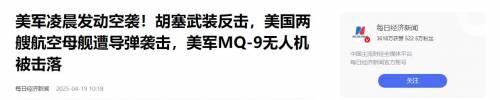 信息源:美军凌晨发动空袭!胡塞武装反击,美国两艘航空母舰遭导弹袭击,美军MQ-9无人机被击落