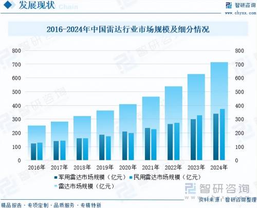 雷达是维护国家安全和发展的重要基石之一。我国的雷达工业是在新中国成立后根据国防建设的需要逐步形成和发展起来的新型工业,相对于西方发达国家起步较晚。目前,雷达行业已成为我国国防现代化建设和参与国民经济主战场的一支实力雄厚的产业大军,形成了中央与地方相结合、沿海与内地相结合、军用与民用结合、专业和门类比较齐全的工业体系,且在部分雷达技术研发领域位于世界先列。数据显示,中国雷达行业市场规模从2016年的252.8亿元增长至2024年的715.3亿元,年复合增长率达13.88%。其中,军用雷达市场规模从2016年的123亿元增长至2024年的340.1亿元,年复合增长率为13.56%;民用雷达市场规模从2016年的129.8亿元增长至2024年的375.2亿元,年复合增长率为14.19%。军用雷达是我国雷达行业中先行攻略的领域,主要应用于为了维护国家安全而进行的系列军事演练、部署行动中。而民用雷达领域是20世纪后期逐步兴起的,起初主要用于气象监测。随着国内雷达技术不断发展,其内涵和研究内容都在不断地拓展,多种新型雷达陆续落地,民用雷达领域逐渐扩大,逐步占据中国雷达事业发展的主导地位。其中,空管雷达作为中国民用雷达行业的增长点,随着民航运输的快速发展,市场对空管设备的需求不断增加。