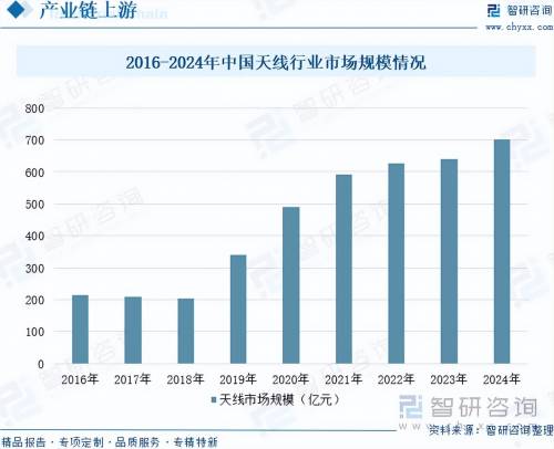天线是空管雷达的“眼睛”,负责发射和接收无线电波。它由多个天线单元组成,可以集中能量并控制波束方向,从而实现对特定区域的扫描和探测。天线的设计直接影响到空管雷达的探测范围、精度和分辨率。天线是一种变换器,在无线电设备中用来发射或接收电磁波的部件。无线电通信、广播、电视、雷达、导航、电子对抗、遥感、射电天文等工程系统,凡是利用电磁波来传递信息的,都依靠天线来进行工作。近年来,随着通信技术的迭代升级,中国天线行业取得了显著的发展。数据显示,中国天线行业市场规模从2016年的215.45亿元增长至2024年的701亿元,年复合增长率为15.89%。未来,伴随天线行业技术不断进步与应用领域持续扩展,空管雷达行业也将迎来更广阔的发展空间和技术支撑。