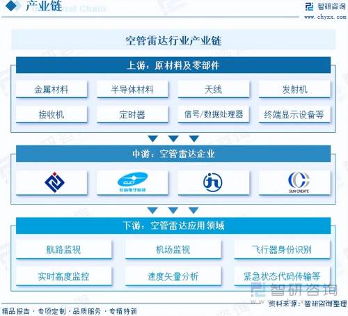 空管雷达产业链上游为原材料和零部件,其中,原材料包括金属材料、半导体材料等;零部件包括天线、发射机、接收机、定时器、信号/数据处理器和终端显示设备等。产业链中游为空管雷达的生产和制造环节,产业链下游为空管雷达的应用领域,包括航路监视、机场监视、飞行器身份识别、实时高度监控、速度矢量分析、紧急状态代码传输等。