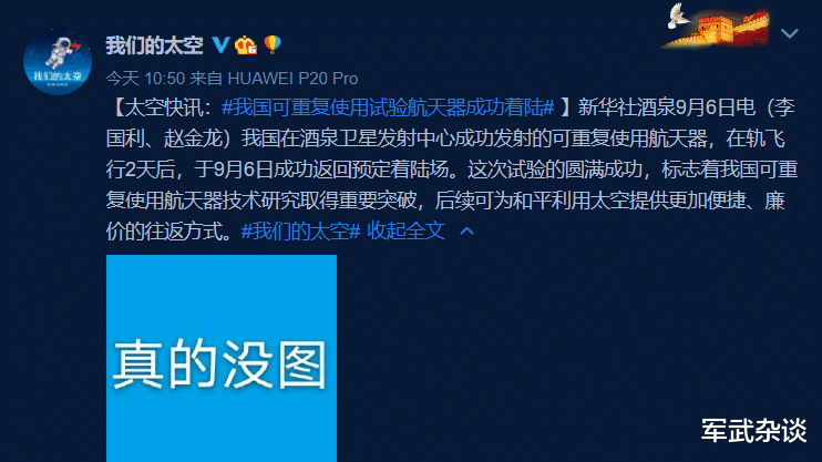 在9月6号中午,根据官方媒体的正式消息,在9月4号由酒泉卫星发射中心发射的,中国首款可重复使用航天器,在经过2天的太空飞行之后,成功着陆返回。这也代表了这款被称为中国版X-37B的太空战机,在此次实验中获得了圆满成功。