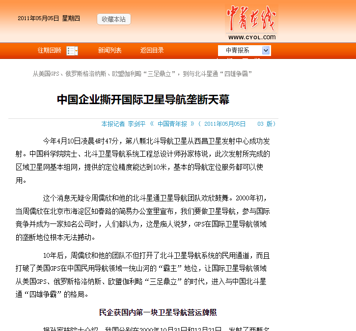 信息来源:《中国企业撕开国际卫星导航垄断天幕》——中国青年报2011-05-05
