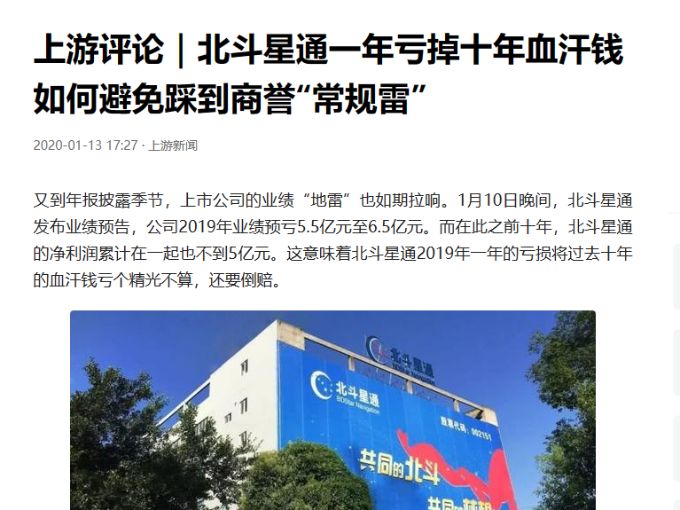 《上游评论|北斗星通一年亏掉十年血汗钱如何避免踩到商誉“常规雷”》——上游新闻 2020-01-13