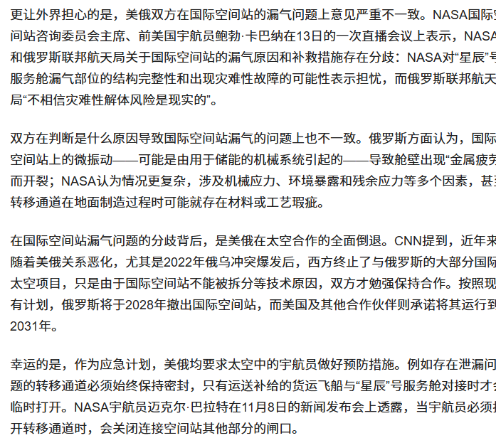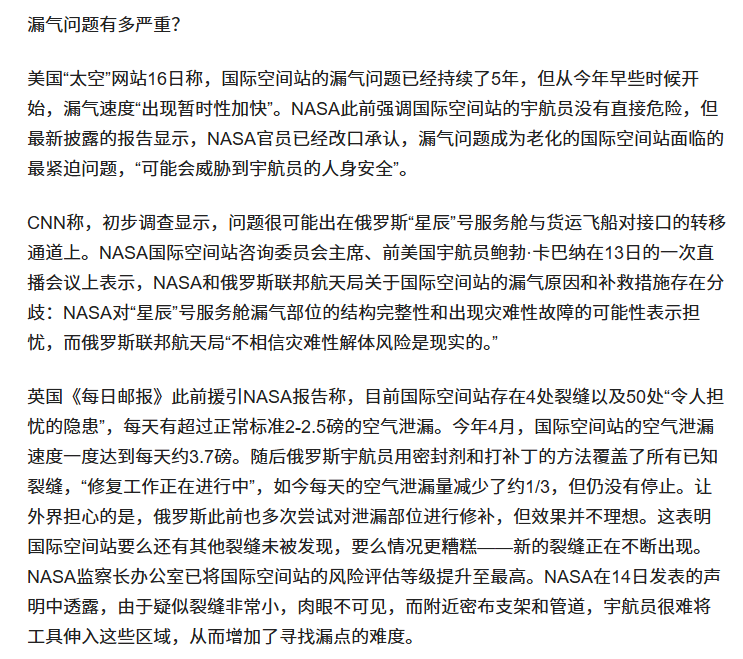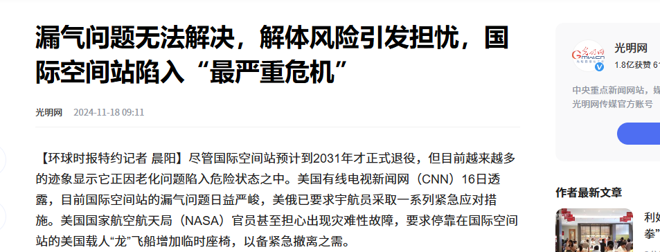 信息来源:光明网 2024-11-18 漏气问题无法解决,解体风险引发担忧,国际空间站陷入“最严重危机”