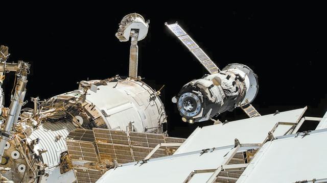 国际空间站的“星辰”号服务舱正与货运飞船对接