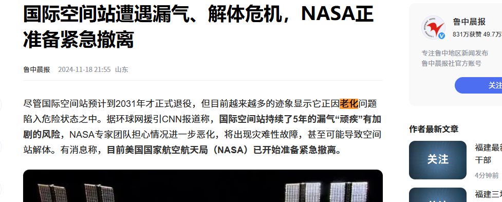 信息来源:鲁中晨报 2024-11-18 国际空间站遭遇漏气、解体危机,NASA正E准备紧急撤离