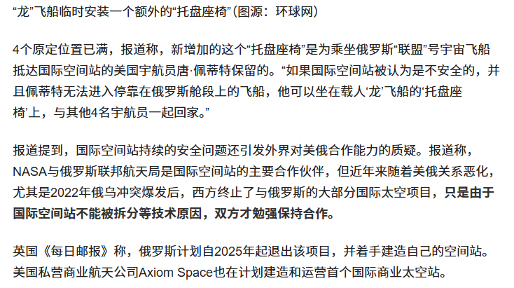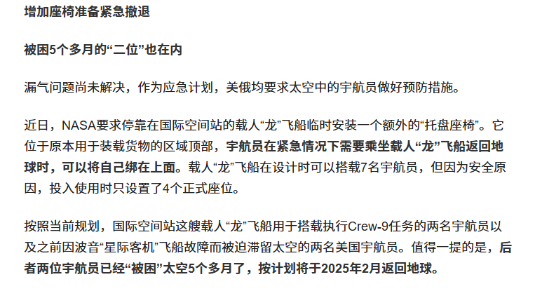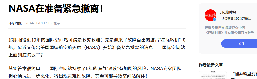 信息来源:环球时报 2024-11-18 NASA 在准备紧急撤离!