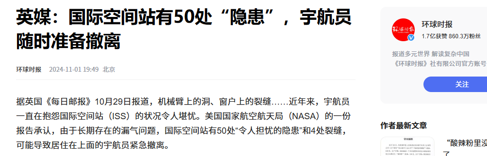 信息来源:环球时报 2024-11-1 英媒:国际空间站有50处“隐患”,宇航员随时准备撤离