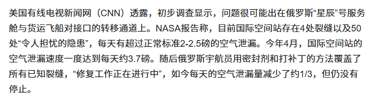 这样一来问题就开始加剧,然而之所以四月份没有传来紧急撤离的消息,是因为那时候俄罗斯的宇航员用密封或者打补丁的方法做了修补。