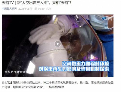 5月11日,中国载人航天发布“天宫TV | 新“太空出差三人组”,亮相“天宫”!”消息,这也是自4月25日进驻中国空间站以来,神舟二十号航天员乘组之下首个报告。