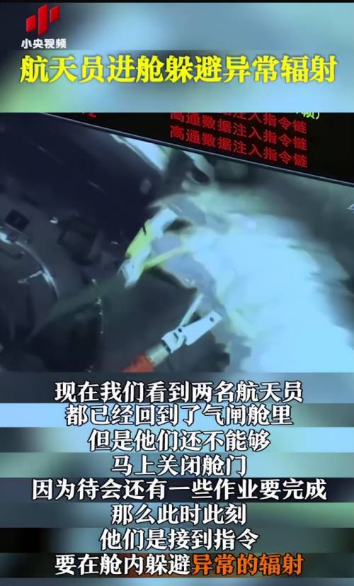 所以,太空出舱相对于在空间站内部来说,其风险程度是极其的高,而且我国此前也遇到过一幕,那就是航天员刘伯明在出舱的时候,地面监测到空间站遭遇了异常辐射,最终不得不采取紧急措施,然后进入舱内,躲避异常辐射。
