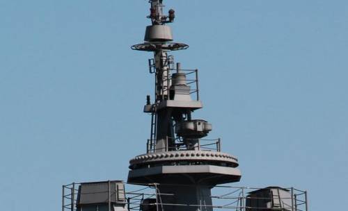 【秋月级桅杆特写,环形天线上方就是电子战系统天线】