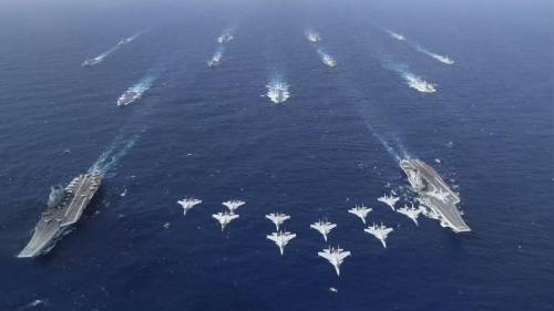 日媒猜测,中国之所以出动大批兵力,首次在西太部署双航母编队,主要是在模拟台海爆发冲突时对抗美国航母的战术,解放军以一艘航母模拟强敌,另一艘航母则进行阻击,切断美军从夏威夷或关岛出兵干涉台海的通道。
