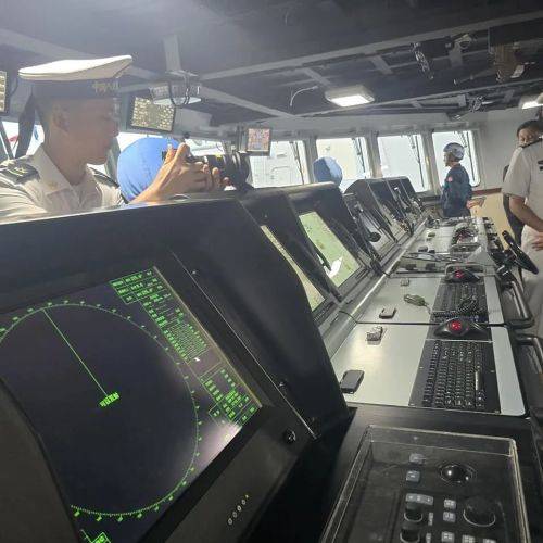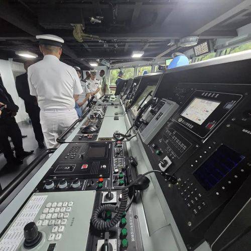 话说这个两排显控台就有点让人摸不着头脑,去年中国海军访问瓦努阿图的时候,曾经公开过一次052D型驱逐舰的航海舰桥。可以发现,我们的驱逐舰舰桥只有一排显控台,右侧是集成式控制设备,左侧是战术显控设备备份,中间是舵信设备,舵信设备右侧是双车车钟,显控台后方、隔着一道拉帘的才是安装有海图板和罗经设备的海图室。