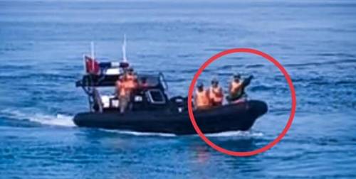 而且菲方的持枪动作也很克制,枪口一直垂地,哪怕被海警人员嘲讽“朝这打”,也没有端枪指人的动作,而是坐视海警把菲方的补给小船拖走。