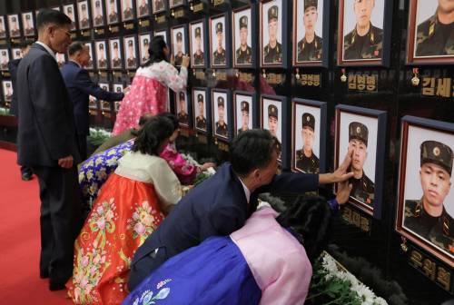朝鲜领导人强忍着悲痛,挨个给追悼壁上的阵亡士兵遗像授予勋章,并亲手献花。