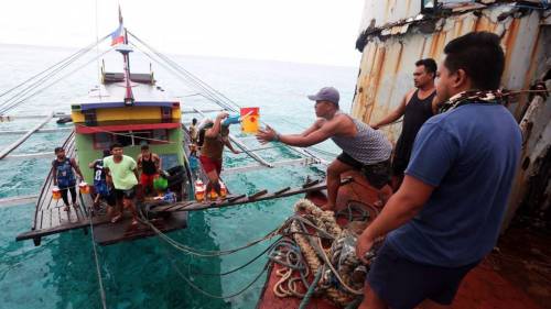 (菲船向坐滩军舰运送补给)