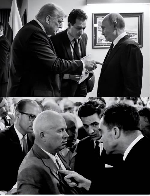 第一张是1959年的历史照片,画面中尼克松正用手指着赫鲁晓夫,那是冷战时期美苏对峙的经典瞬间。
