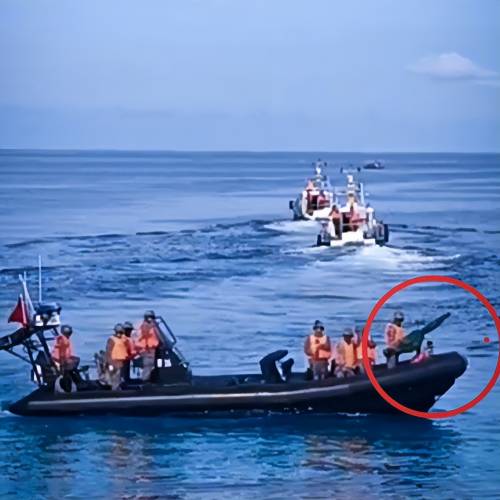 菲军方发布的视频显示,他们竟然当着中国海警的面放出两艘橡皮小艇,试图阻止我海警巡逻艇靠近其坐滩军舰。但从体型上看,这简直是螳臂当车。