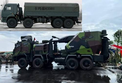 从目前漏出的照片看,这款新车载炮是使用了8X8卡车底盘,虽然车头标的是越南军用电子电信公司的Viettel标志,但是其轮胎布局和其他细节都显示,它其实很可能是俄罗斯的卡玛兹重卡底盘,特别是卡玛兹-63501重卡的细节就与该炮的底盘非常相近。