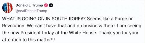 【特朗普发文质问称:“韩国到底发生了什么?像是一场清洗或革命】