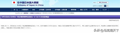 8月27日,日本驻华使馆对外发表旅行警告称,中国在9月3日抗日战争胜利纪念日当天,反日情绪相当高涨,因此在华或赴华的日本公民要高度警惕人身安全与周围环境。